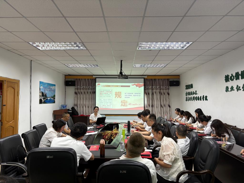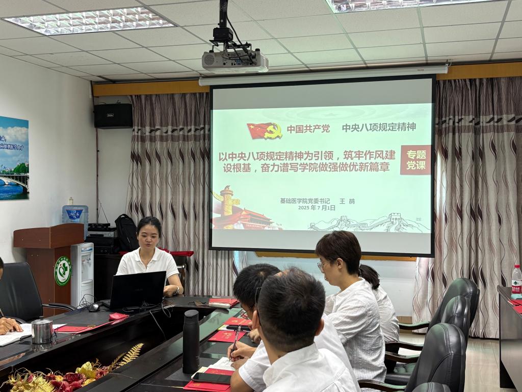 7月1日下午,基础医学院党委书记王鹃在西苑笃行楼三楼会议室结合深入贯彻中央八项规定精神学习教育讲授专题党课。党课主题是“以中央八项规定精神为引领,筑牢作风建设根基,奋力谱写学院做强做优新篇章”,全体教师党员、教师入党积极分子参加。
